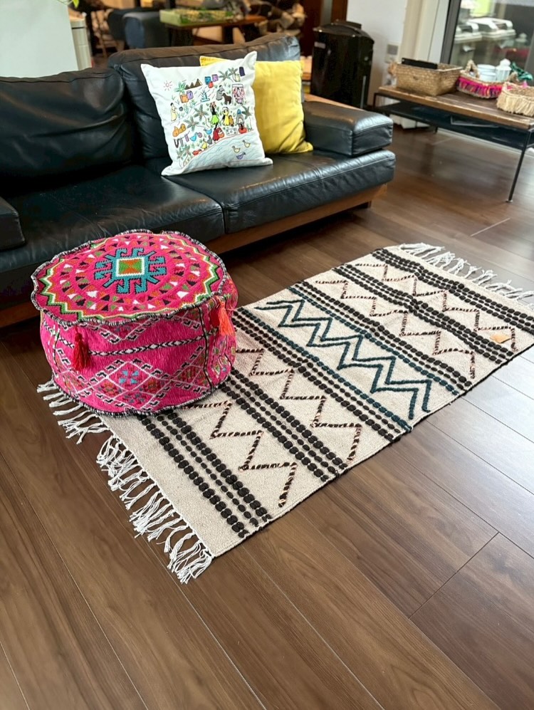 移動できるテントのようなものに住み、床に素敵なマットを引いて、服や荷物はこのプフに入れて。